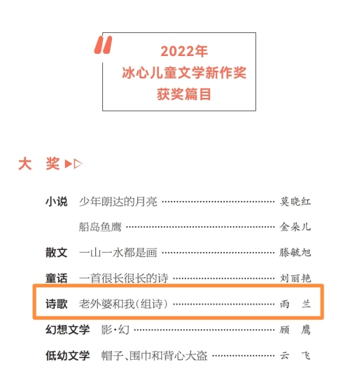 近日,2022年冰心儿童文学新作奖获奖名单公布,民进会员雨兰创作的《老外婆和我(组诗)》荣获新作奖大奖。